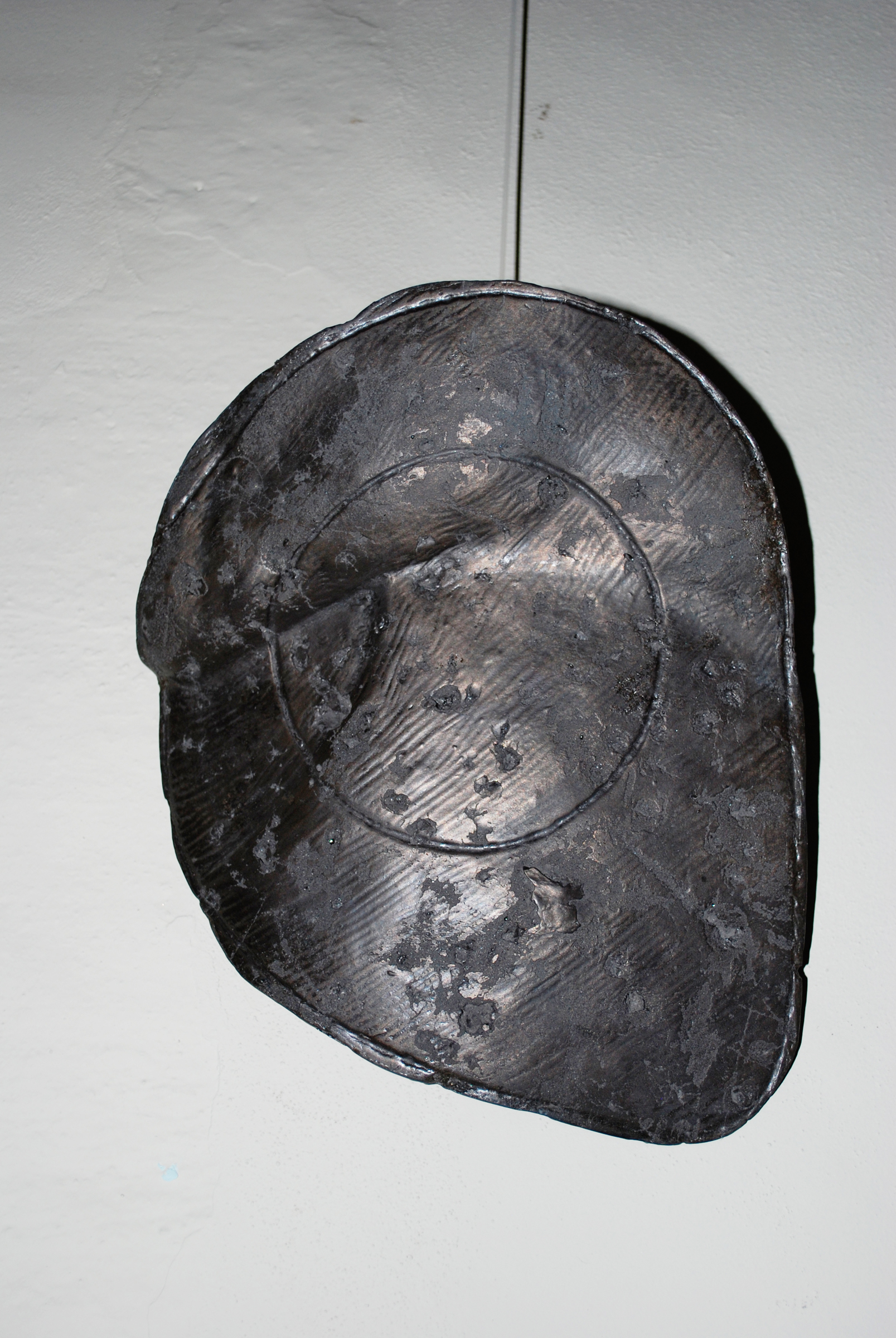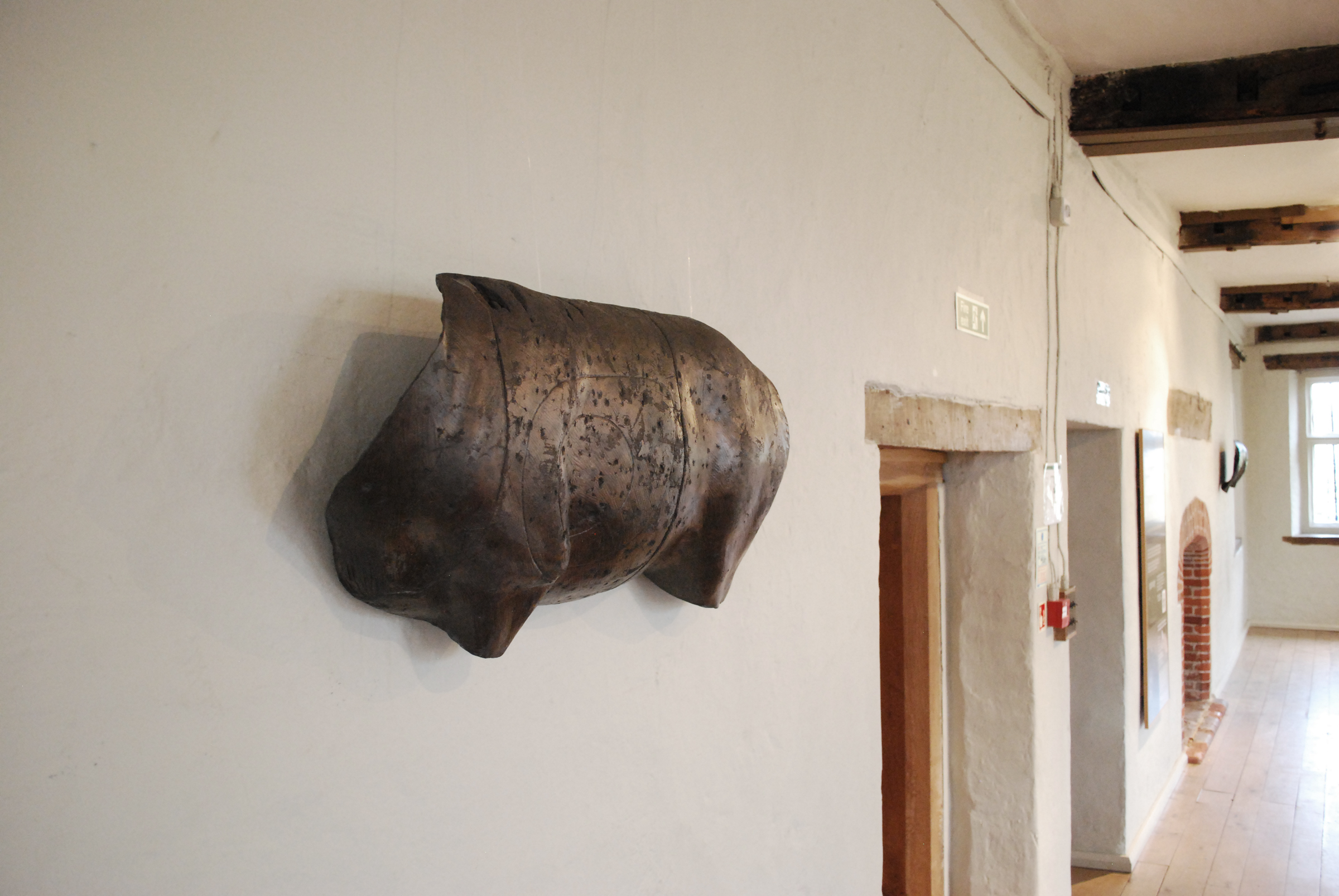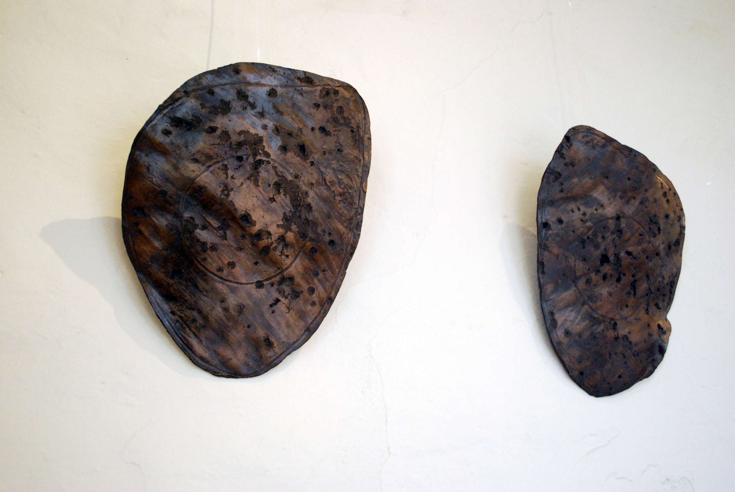 Lesley Logue Damaged Armour – Eastbury Manor. I was invited to respond to the house and it’s history within the community. The works, 5 resin and bronze cast sculptures and an installation of found arrows, were sited in the East Chamber room, formerly used by Barking Museum to display armoury. The work references trophy displays of hunted animals and at the same time reference armour, playing with the juxtaposition of the vulnerability of animal hide and the protective shield of armour. The exhibition also included the work Misfire, an installation of misfired arrows found buried around outdoor archery ranges.